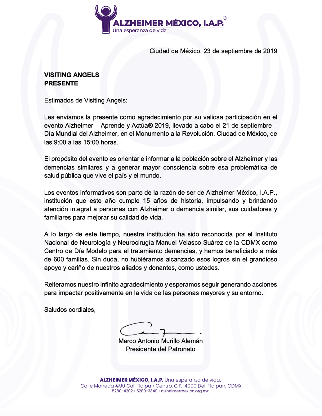 Durante el mes de septiembre Visiting Angels tuvo el honor de participar en un evento masivo en el monumento a la revolución para traer más conciencia a la sociedad sobre el tema creciente del Alzheimer. Estamos profundamente agradecidos por el reconocimiento que se nos ha dado a Visiting Angels México por nuestra participación en septiembre pasado.